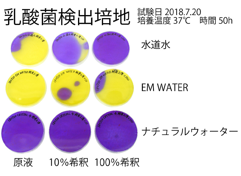 EM WATERでは乳酸菌が増えて活発化した(培地色が黄色)のに対し、ナチュラルウォーターでは乳酸菌が全く増えず全滅してしまいました(培地色が紫色)。