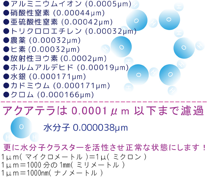 不純物のない純度の高い水(H2O)、そして活性している振動数の高い水分子を理想とし、私達はアクアテラを開発し、今も尚、水の研究及びアクアテラの研究も続いています。