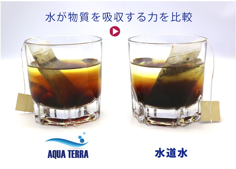 上記動画はアクアテラと水道水に紅茶を入れて、攪拌する事なく、そのまま45分間(10000倍速)放置して、水が物質を吸収する様子を比較実験したものです。