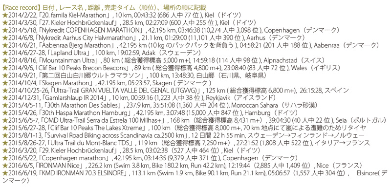 また、デンマークオーフス大学での転写因子や酵素研究中の傍ら有酸素運動の必要性についても研究し、2014年2月~2016年6月までの2年間にサハラマラソン(日本人としては3位)を始めとする合計21レース1744kmやサバイバル北欧縦断ロードバイク2500kmなど挑戦するアスリート学者でもあります。