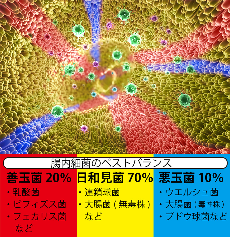 腸内フローラは常に腸内環境をベストにする為に、他の種類の腸内細菌との調和をはかり、活動を終えた腸内細菌を排泄する事で恒常性維持機能を保っています。