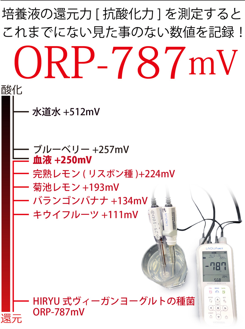 ●HIRYU式ヴィーガンヨーグルトの乳酸発酵培養液のORP測定すると、これまでに見た事がない還元力-787mVを記録しました!