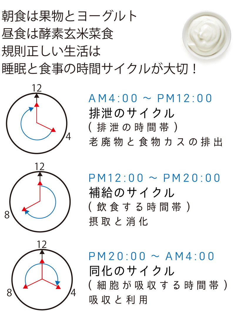 人間の体には、排泄→補給→同化の3つのサイクルが8時間ごとに切り替わるシステムが備わっており、この生体リズムに則ったタイミングで生理機能を妨害しない適切な食事を摂ることが理想とされています。