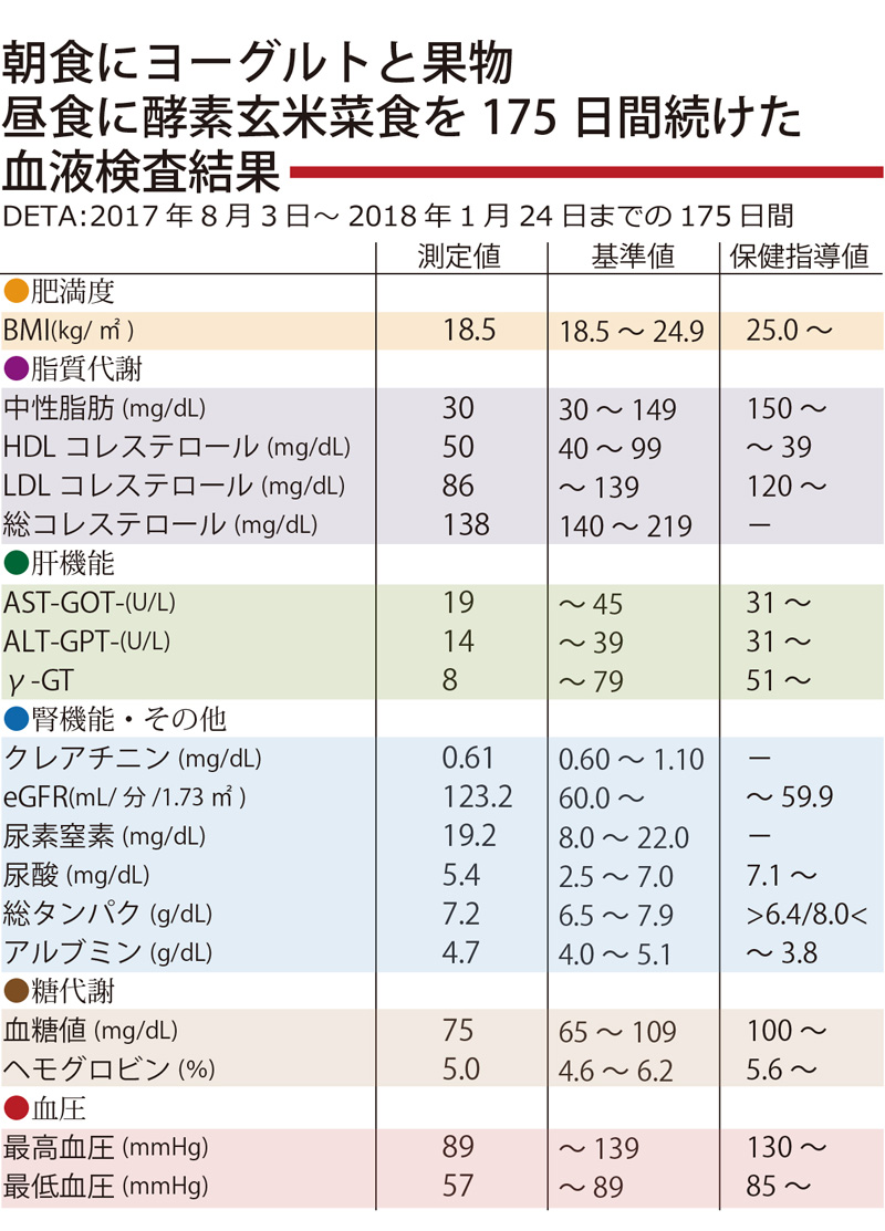 上記検査項目以外に毎日同時刻に血圧、安静時心拍数、体重、体脂肪、体温を計測を行い、HIRYUの食プログラム(ヴィーガンヨーグルト・フレッシュジュース・酵素玄米菜食)を175日間、血糖値モニタリングや、血液検査を行い、生活習慣病リスクがない事を確認しました。